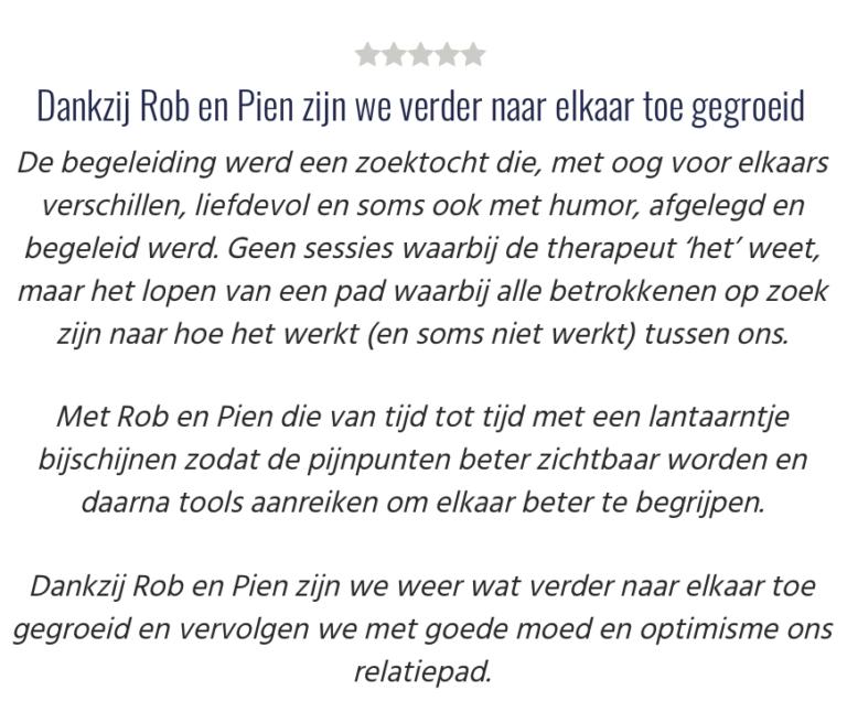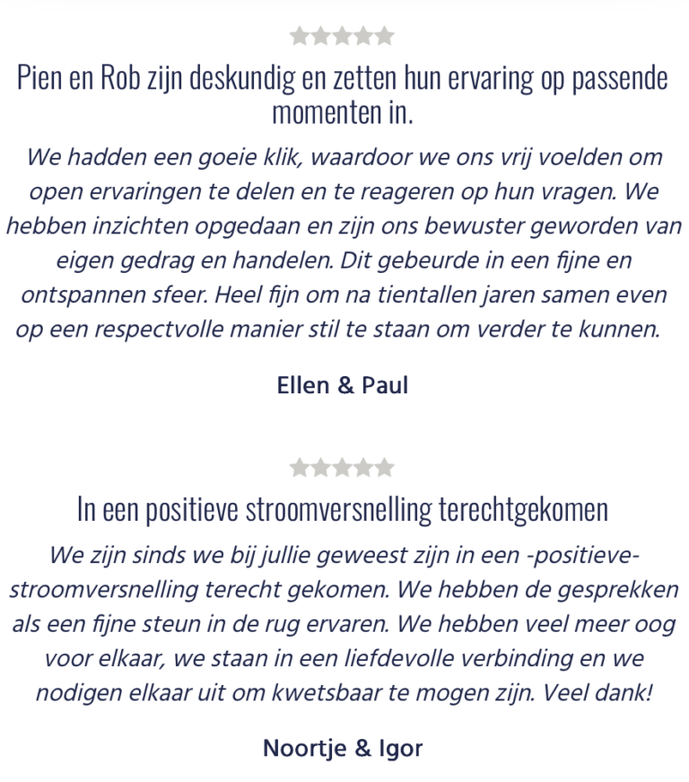 Een traject bestaat meestal uit minimaal 5 sessies, waarvan 2 individuele sessies. Daarna kijken we wat nodig is en bepalen we het vervolg. Meestal zijn 5 sessies voldoende en aansluitend is altijd een periodieke ‘relatie-APK’ mogelijk als jullie daar behoefte aan hebben.
